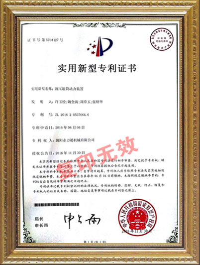 • 液壓滾筒動力裝置新型專利證書